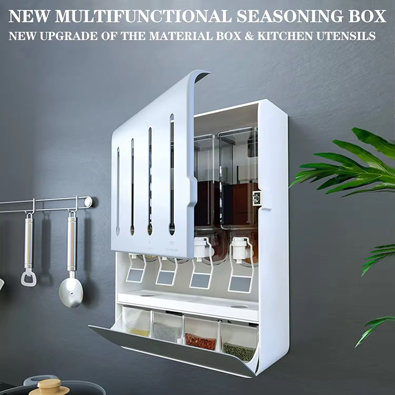 C1D6102B-1E2A-4761-911C-153BC77C1870La boîte murale multifonction pour condiments est l’outil indispensable pour une cuisine ordonnée et efficace. Elle combine ingénieusement 4 compartiments pour condiments liquides (huile, sauce soja, vinaigre, vin de cuisson) avec 5 récipients pour condiments secs (sel, poivre, piment, etc.).
